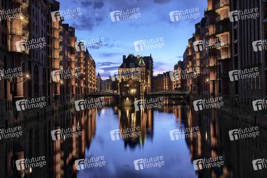 Teekontor im Wasserschloss fotografiert von der Poggenmühlenbrücke in der Speicherstadt. Hamburg, 03.03.2020