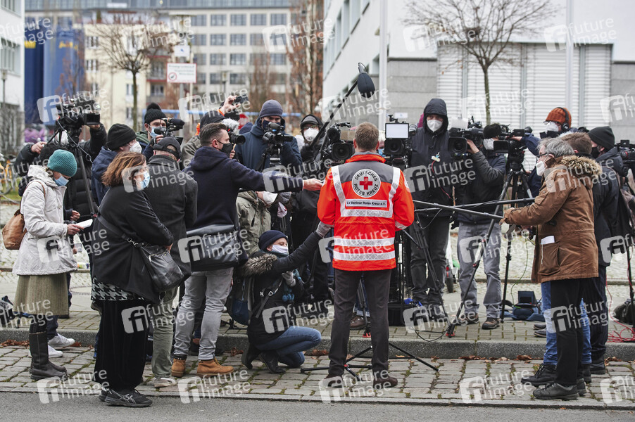 Mario Czaja (Präsident Berliner Landesverband Deutsches Rotes Kreuz, DRK) und Journalisten bei der Inbetriebnahme des Corona-Impfzentrums in der Arena Berlin. Berlin, 27.12.2020