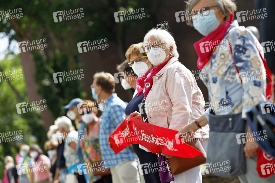 Menschenkette, Demo, Demonstration, Pilger, Pilgermarsch, Protestmarsch, Aufbruch nach Köln, Maria 2.0, Aktivisten, Kirche, Gläubige, Christen, Erzbistum Köln, Kundgebung, Protest gegen Woelki, Missbrauch, Missbrauchskandal, Forderungen, Aufarbeitung