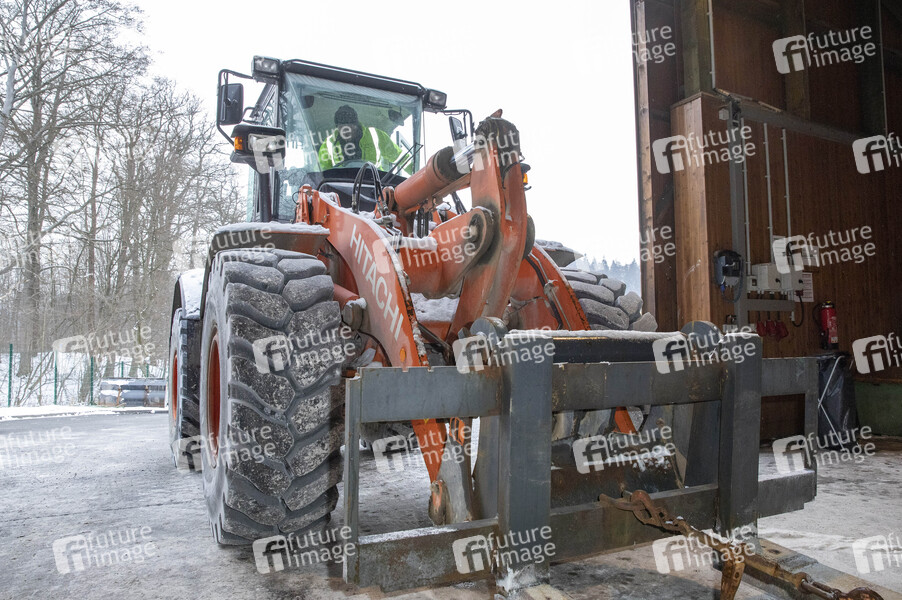 Radlader in der Streusalzhalle beim Zusammenschieben des Streusalzes beim Fototermin mit freundlicher Genehmigung der BDL Leitung des Betriebsdienstes der Autobahnmeisterei Remscheid. Remscheid, 10.02.2021