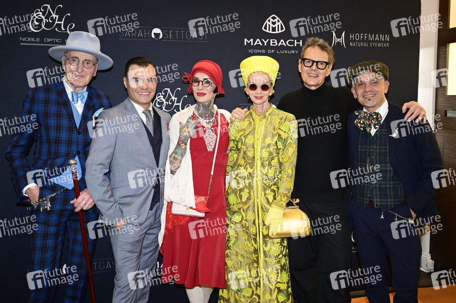 Günther Krabbenhöft, Dieter Padar, Sarah Settgast, Britt Kania, Rolf Scheider und Carlos Eduardo Davila Federico bei der Präsentation der neuen exclusiven 'Sarah Settgast Kollektion by Hoffmann Natural Eyewear Kollektion' im Noble Optic House im Maybach Store Kurfürstendamm. Berlin, 29.11.2024