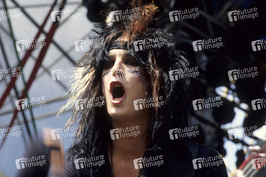 Nikki Sixx von Mötley Crüe live auf dem Monsters of Rock Festival 1984 im Donington Park. Donington, 18.08.1984