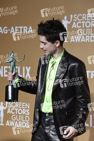 Timothee Chalamet mit dem Preis für den besten Kin-Hauptdarsteller in 'Like a Complete Unknown' beim Preisträger-Photocall der 31. Screen Actors Guild Awards 2025 im Shrine Auditorium and Expo Hall. Los Angeles, 23.02.2025