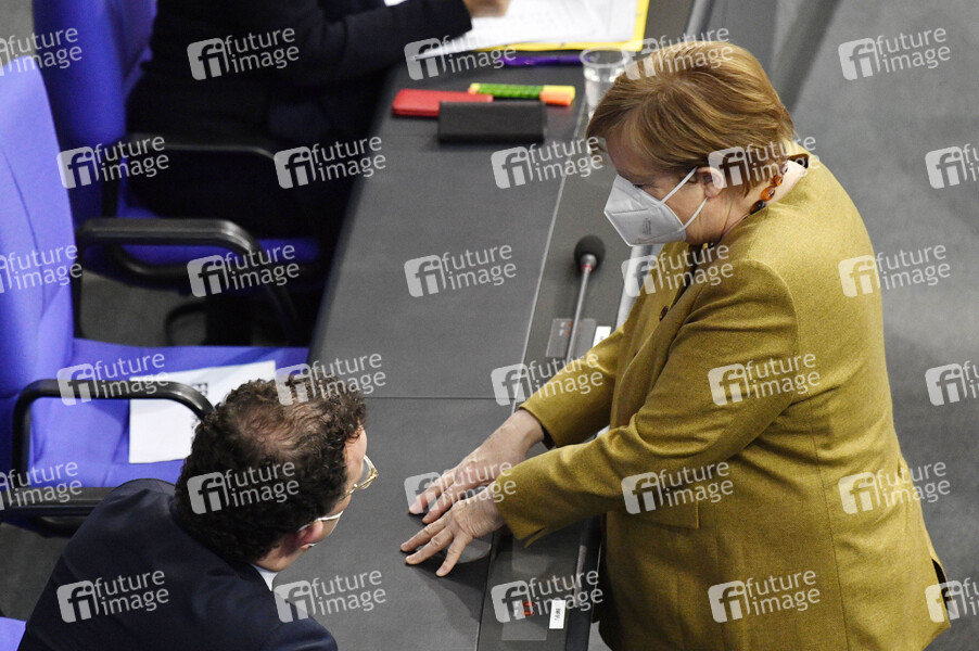 Jens Spahn und Angela Merkel in der 215. Sitzung des Deutschen Bundestages im Reichstagsgebäude. Berlin, 04.03.2021