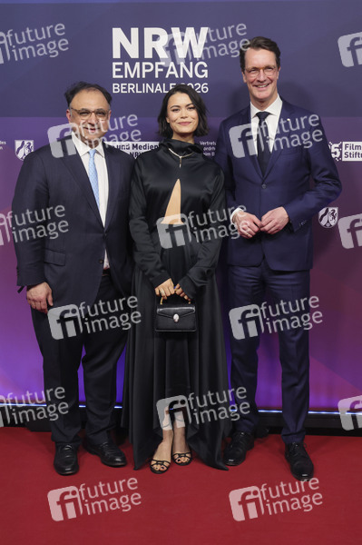 Walid Nakschbandi, Tomomi Themann und Hendrik Wüst beim 23. NRW Empfang des Landes NRW und der Film- und Medienstiftung NRW im Rahmen der Berlinale 2026 in der Vertretung des Landes Nordrhein-Westfalen. Berlin, 15.02.2026