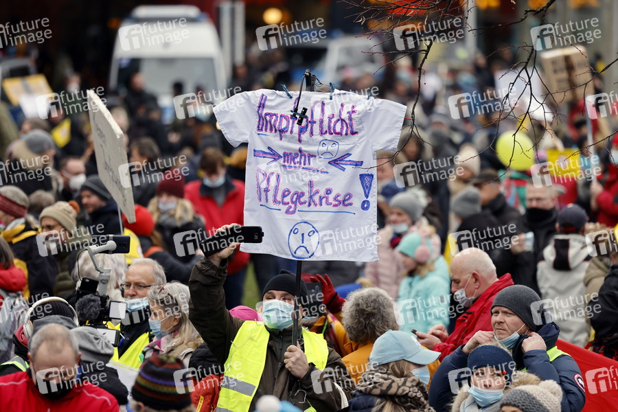 Bei einer angemeldeten Demo demonstrierten etwa 8000 Gegner einer Impfpflicht mit einem Spaziergang gegen die Corona-Maßnahmen der Bundesregierung - darunter auch viele Pflegekräfte, die wegen der Impfpflicht im Gesundheitsbereich ihren Job zu verlieren drohen. Düsseldorf, 15.01.2022