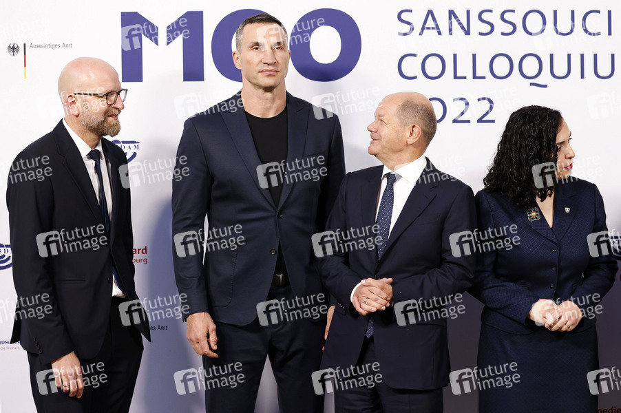 Moritz van Dülmen, Wladimir Klitschko, Olaf Scholz und Vjosa Osmani bei der Verleihung des M100 Media Award 2022 für das ukrainische Volk in der Orangerie Sanssouci. Potsdam, 15.09.2022