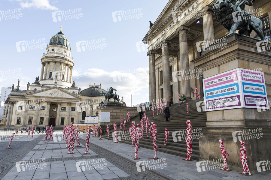 Installation 'It is like it is' des Künstlers Dennis Josef Meseg auf dem Gendarmenmarkt. Mit rotweißem Flatterband umwickelte Schaufensterpuppen sollen ein Mahnmal zur Coronakrise darstellen. Berlin, 03.04.2021