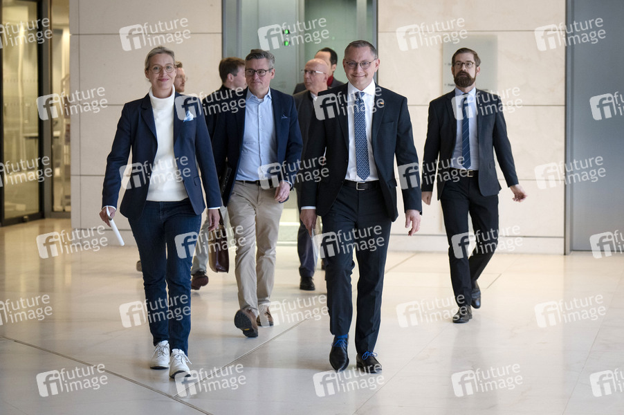 Alice Weidel und Tino Chrupalla beim Pressestatement zur Fraktionssitzung der AfD-Bundestagsfraktion im Reichstagsgebäude. Berlin, 12.03.2025