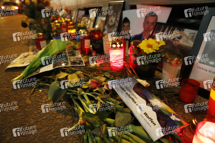 Kerzen, Blumen und Fotos vor der Ukrainischen Botschaft zum Gedenken an die 'Maidan-Opfer' in Kiew. Berlin, 04.03.2014