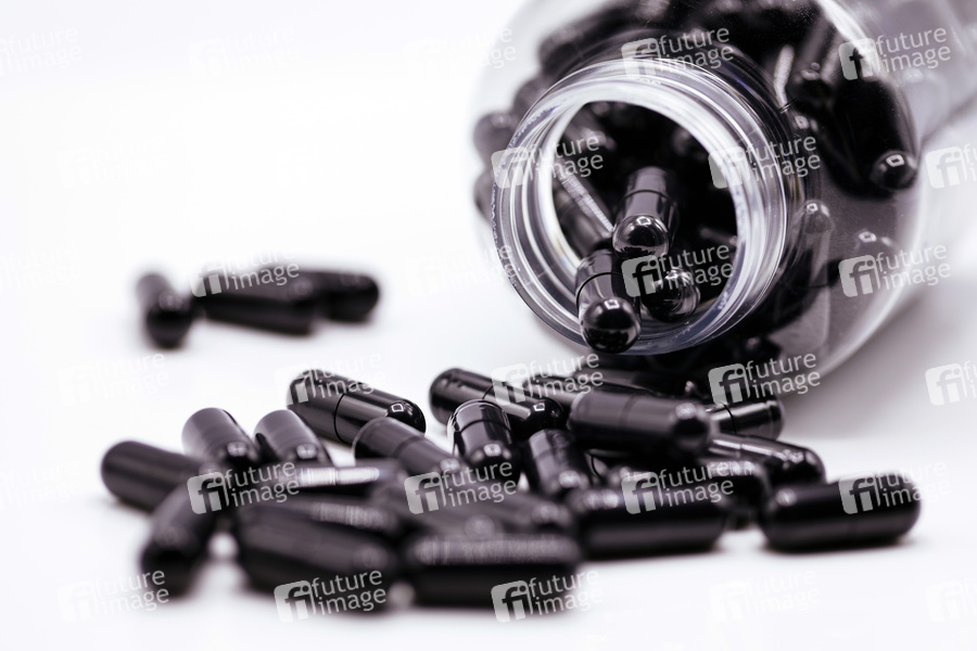 Schwarze Pillen mt Pillenflasche. Köln, 08.05.2019