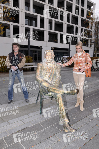 Nikolai Tregor und Ursula Gottwald bei der Ankunft und Präsentation der Bronze-Statue von Helmut Dietl vor dem Andoz Hotel in München-Schwabing. München, 10.11.2020