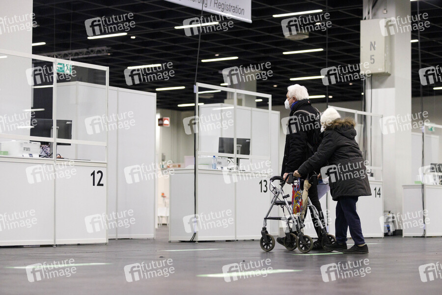 Das Kölner Impfzentrum in den Hallen der Koelnmesse hat eröffnet. Zuerst werden dort nun die Über-80-Jährigen geimpft – vorausgesetzt sie haben einen der Impftermine bekommen. Aufgrund der Verzögerung bei den Impfstoff-Lieferungen der Hersteller Biontech und Pfizer musste der Impfstart in NRW bis nun verschoben werden. Elisabeth Steubesand, mit 105 Jahren die älteste Kölnerin, war die erste Patientin, die im Impfzentrum ihre Impfung erhielt. (Themenbild, Symbolbild) Köln, 08.02.2021