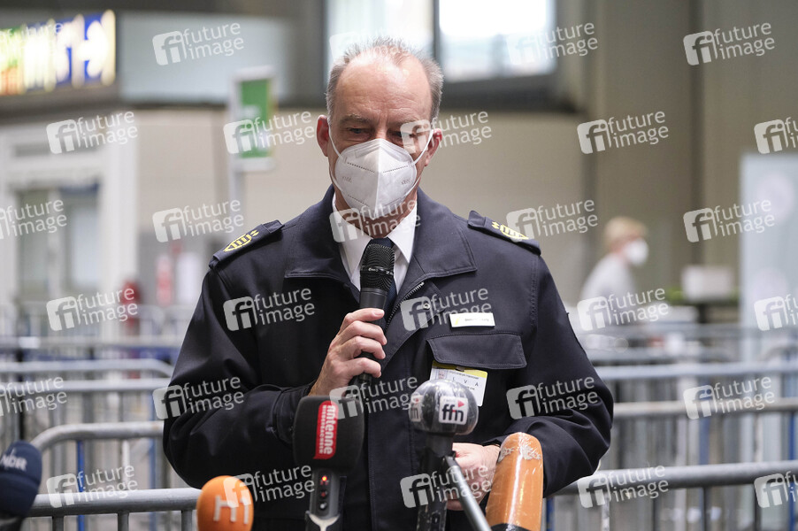 Dieter Rohrberg (Direktor der Feuerwehr) bei der Eröffnung des Gemeinsamen Impfzentrums (GIZ) von Region und Landeshauptstadt Hannover auf dem Messegelände in der Messehalle 25. Hannover, 01.02.2021