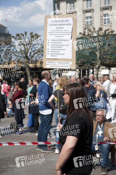 Demonstranten auf der Demo gegen die Einschränkung der Grundrechte wegen der Covid-19 Pandemie vor dem Hamburger Rathaus. Hamburg, 09.05.2020