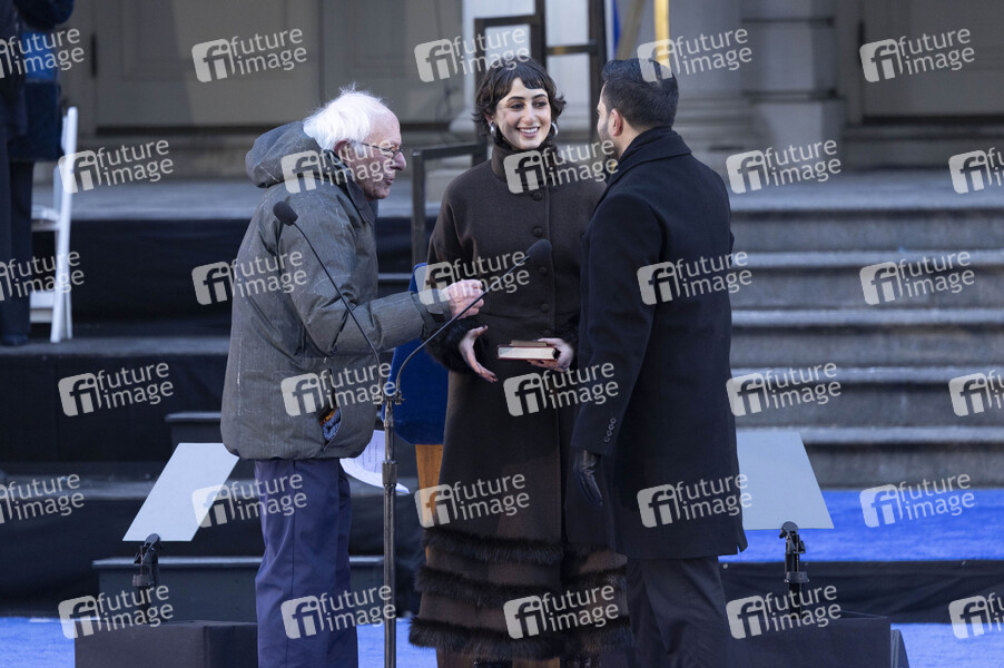 Bernie Sanders, Rama Duwaji und Zohran Mamdani bei der Amtseinführung von Zohran Mamdani zum ersten muslimischen Bürgermeister von New York City in Rathaus. New York, 01.01.2026