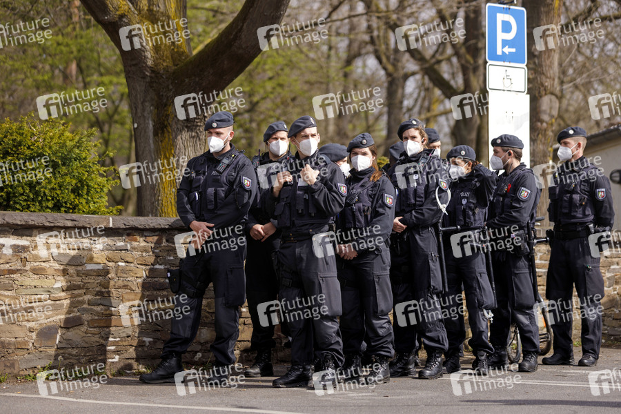 Die Stadt Leverkusen befürchtete eine größere Menschenansammlung bei der Beerdigung eines hochrangigen Clan-Mitglieds einer Großfamilie und damit Verstöße gegen die Corona-Schutzverordnung. Polizisten sichern das Gelände um den Friedhof Reuschenberg vor der Beerdigung. Leverkusen, 09.04.2021