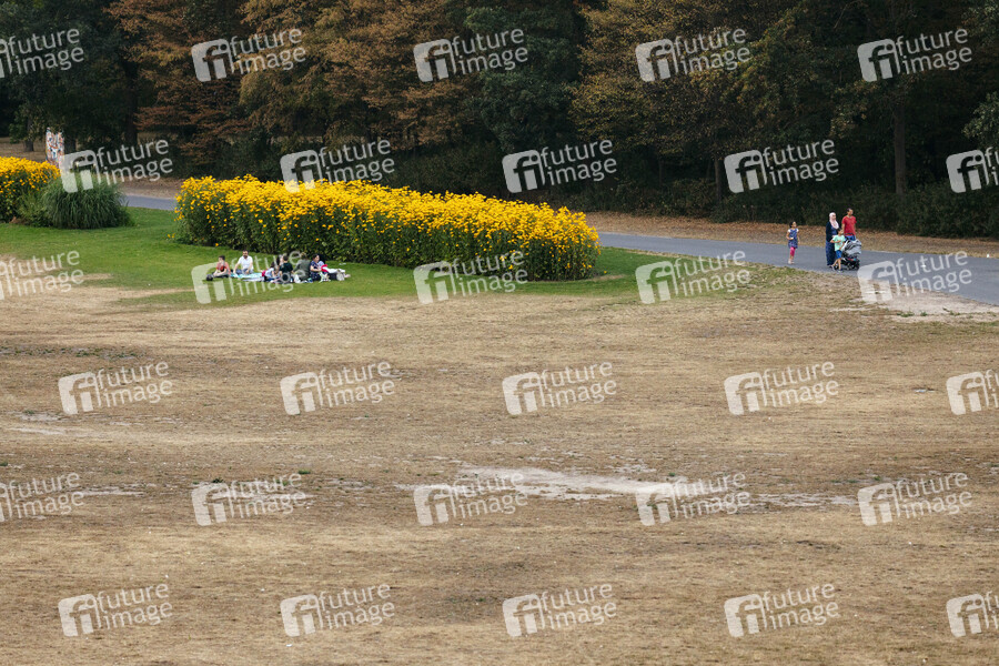 Die sommerliche Hitze und der Regenmangel haben weite Teile der Parkanlagen in der Bonner Rheinaue verdorren lassen und für erhebliche Rasenschäden gesorgt. Bonn, 14.08.2020