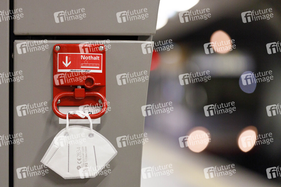 An einer Notbremse in einer Bahnhaltestelle hängt eine FFP2-Maske. Der Bundestag soll am kommenden Mittwoch über die sogenannte Bundes-Notbremse entscheiden. Die von der Bundesregierung geplanten Änderungen am Infektionsschutzgesetz sehen unter anderem eine nächtliche Ausgangssperre vor. (Themenbild, Symbolbild) Köln, 14.04.2021