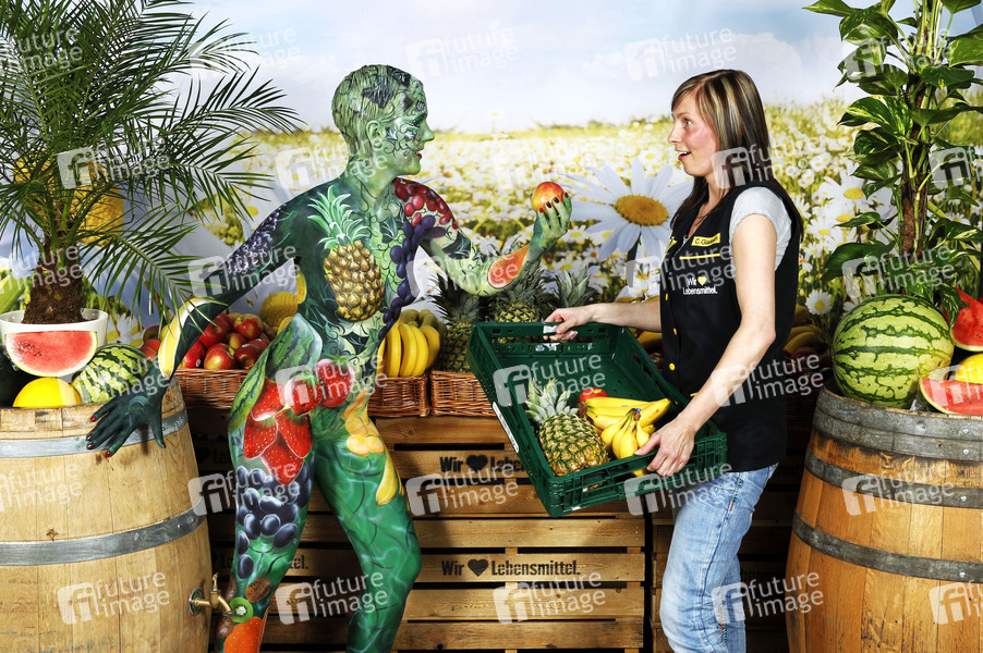 WORKING ART ist eine Bilderserie des Künstlers Jörg Düsterwald und des Fotografen Tschiponnique Skupin. Dabei werden Berufe mit der künstlerischen Bildsprache der Körpermalerei neu dargestellt. In den Schaffensprozess werden reale Unternehmen und authentische Locations eingebunden, um eine Symbiose zwischen Arbeitswelt und Kunst zu schaffen. Hier ein Shooting mit Model Renée-Claire und Obstverkäuferin Carolin im Forum Center. Wolfenbüttel, 26.06.2015