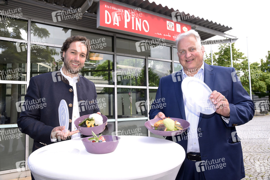 Bürgermeister Andreas Bukowski und Christian Schottenhamel beim Pressetermin zur Initiative MehrWeg MehrWert mit der DEHOGA Bayern im Ristorante Da Pino. Nach einer im Januar vom Bundestag beschlossenen Novelle des Verpackungsgesetzes müssen Restaurants, Caterer, Gastronomie, Bistros, Cafés - alle Unternehmen, die To-Go und Take-Away anbieten, ihre Lebensmittel in Zukunft in Mehrwegbehältern verpacken. Schon ab dem 3. Juli dieses Jahres wird die Verpackung in Kunststoffbehältern untersagt. Deshalb haben die Wirtschaftsförderung der Gemeinde Haar, die DEHOGA und der Gewerbeverband Haar-Trudering bereits 2020 die Initiative MehrWeg MehrWert auf den Weg gebracht. Haar, 25.06.2021