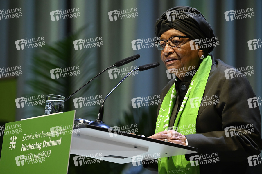 Politikerin, 2006-2018 die 24. Präsidentin von Liberia, Friedensnobelpreisträgerin, Rede, Vortrag, Panel, Kirche, Christen, Christentum, evangelisch, Gläubige, Religion, Politik, 37. Deutscher Evangelischer Kirchentag Dortmund 2019
