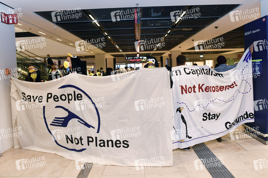 Klimaaktivisten der Aktionsgruppe 'Am Boden bleiben' protestieren gegen die Eröffnung des Flughafens Berlin-Brandenburg (BER). Schönefeld, 31.10.2020