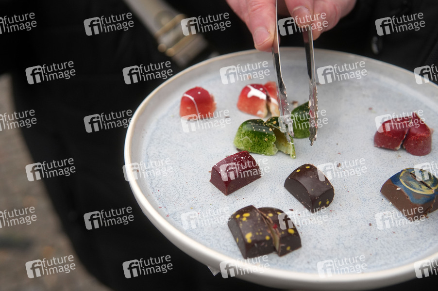 Kunstvoll handgefertigte Pralinen. Das Gelbe vom Ei - kunsthandwerklicher Ostermarkt auf dem Karl-August-Platz in Charlottenburg (Symbolfoto, Themenfoto). Berlin, 24.03.2024