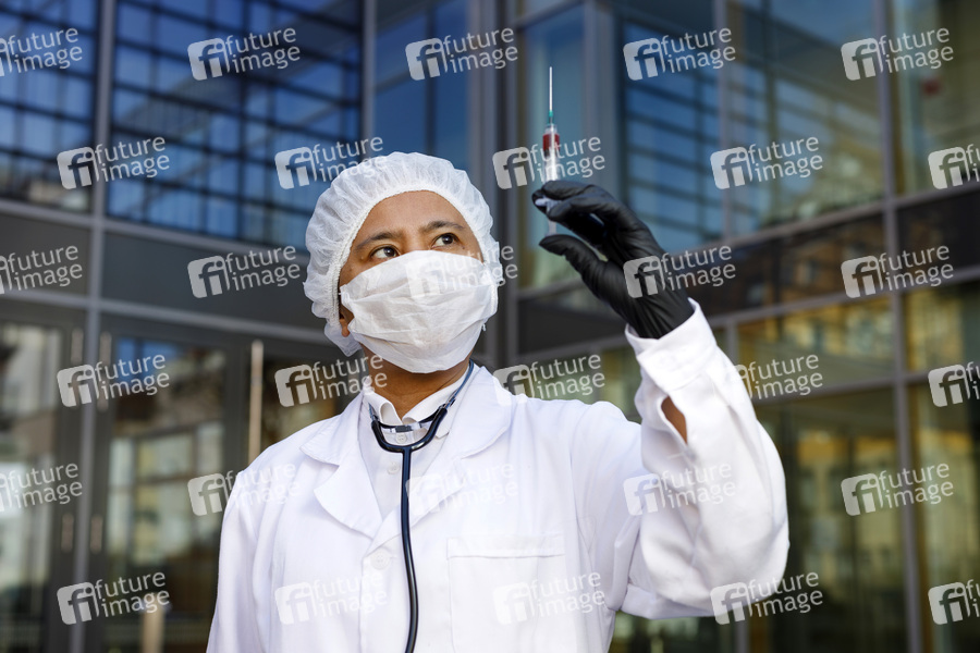 Eine Virologin posiert mit einer Spritze zur Impfung gegen das Corona-Virus. (Symbolfoto mit Model) Nürnberg, 23.04.2020