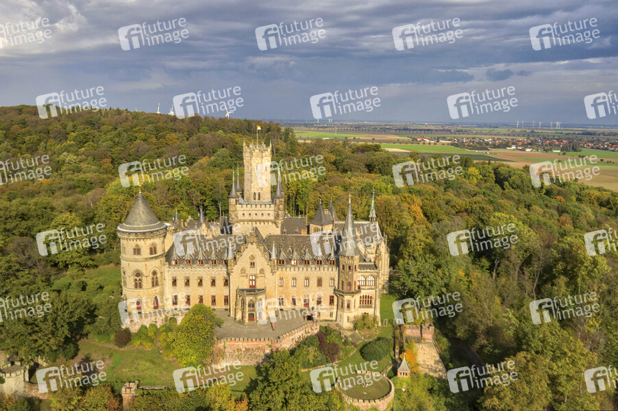 Luftbild vom Schloss Marienburg im Herbst auf dem Marienberg (Freigabe zur Veröffentlichung für Presse-und Öffentlichkeitsarbeit ist von Frau Annette Langhorst als Pressevertretung des Schloss Marienburg/EAC GmbH erteilt worden). Nordstemmen, 13.10.2019