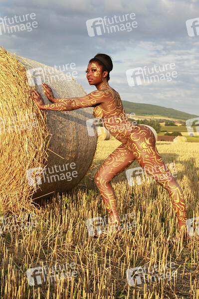 Bodypainting, Erotik, Frau, Mädchen, Afrikanerien, nackt, draußen, weiblich, Körperkunst, Kunst, Ornamente, Malerei, Feld, Acker, Stoppelfeld, Heuballen, Stroh, Landwirtschaft, Ernte, Abendsonne, erotic, African woman, girl, nude, outdoor, female, body art, body painting, ornaments, field, hay, straw, farming, harvest, evening sun