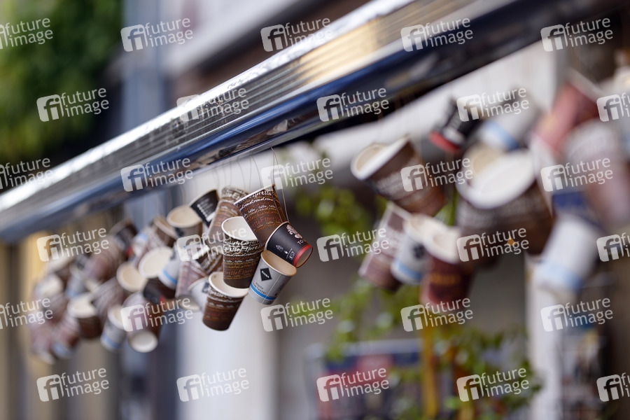 Kaffee, Coffee, Cafe, Kaffeebecher, Kaffee to go, Coffee to go, Cafe to go, Trinkbecher, Cup, Plastikmüll, Papiermüll, Müll, Wegwerfen, Müll, Müllverwertung, Basteln, Müllproduktion, Take-Away, Müllberge, Girlande, Coronakrise, Corona, Corona-Krise, Kiosk, Kioskkultur, zum Mitnehmen, Einweg, Einweggeschirr, Einwegbecher, Einweg, Abfall, Abfälle, Abfallentsorgung, Entsorgung, Abwallwirtschaft, Becherpfand, Becher, Behälter, Tasse, Coffe-to-go, Kaffee-to-go, entsorgen, Entsorgung, Pappbecher, Pappe, Umweltbewusstsein, Umweltbelastung, Verpackungen, Verpackungsmüll, Verpackungsmaterial, Wegwerfgesellschaft, wegwerfen, Wegwerfbecher, Symbolbild, Symbolfoto