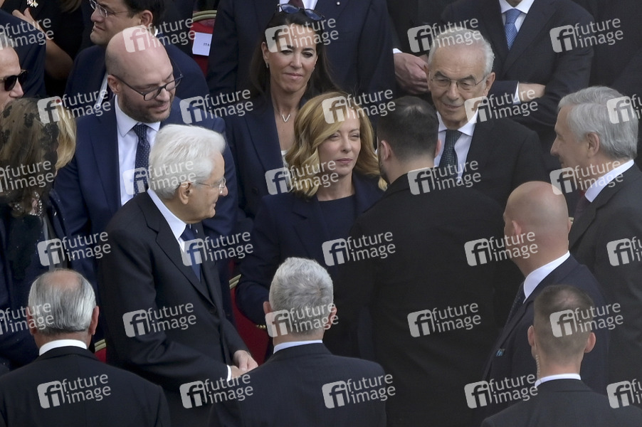 Enthronement, Amtseinführung, Pontifex, Kirche, Religion, Oberhaupt der römisch-katholischen Kirche, Souverän des Vatikanstaats, Vatikan, Präsident der Ukraine, Ministerpräsidentin von Italien, Politiker, Politikerin, Volodymyr Zelenskyy, Präsident der Italienischen Republik