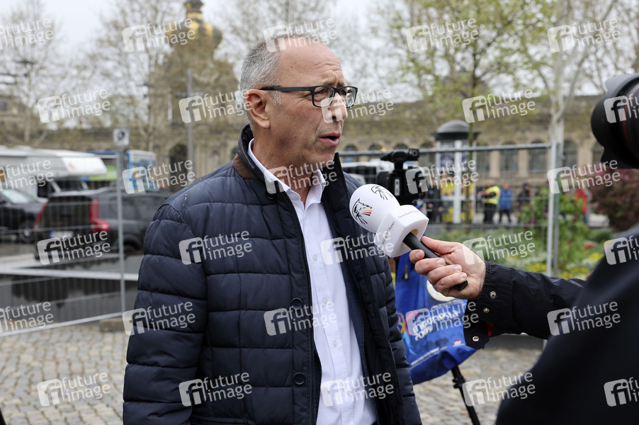 Jörg Urban bei einer 'Friedensprozession' am Karfreitag unter dem Motto 'Frieden kennt keine Brandmauern' auf dem Postplatz. Dresden, 18.04.2025