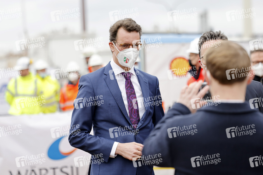 Politiker, CDU, Union, Ministerpräsident des Landes Nordrhein-Westfalen, NRW-Ministerpräsident, Auftritt, Shell, Industrie, Raffinerie, Royal Dutch Shell, Produktionsanlage, Gaskonzern, Gasindustrie, Ölindustrie, Ölkonzern, Treibstoff, Klimaziele, Förderung, Energiewende, Chemieindustrie, Kohlendioxid-Ausstoß, Gas, Erneuerbare Energien, Umweltschutz, Energietechnik, Umweltpolitik, Gaspreis, Gaspreise, Industriepolitik, Energiepolitik, Shell Energy, Chemicals Park Rheinland, CO2-neutral, Nachhaltigkeit, CO2-Neutralität, Biogas, Bio-Gas, Bio-LNG, flüssiges Gas, Biomethan, Methangas, Methan-Gas, Baustelle