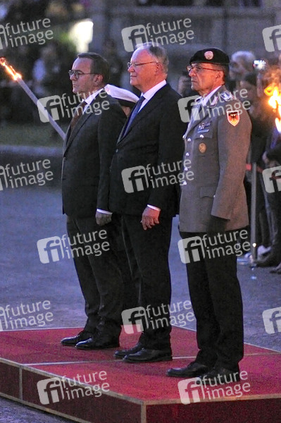 Boris Pistorius,Stephan Weil und Oberst Dirk Waldau bei der Serenade zu Ehren von Ministerpräsident Stephan Weil zu dessen Rückzug aus der Politik vor dem Gartensaal vom Neuen Rathaus. Hannover, 19.05.2025