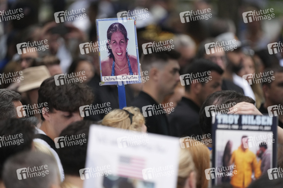 Fotos von Anschlagsopfern bei der Gedenkfeier für die Opfer der Terroranschläge vor 21 Jahren am 9/11 Memorial. Mit Schweigeminuten und der Verlesung der Namen der fast 3000 Todesopfer haben die USA am Sonntag an die Terroranschläge vom 11. September 2001 erinnert. Am früheren Standort des World Trade Centers in New York verlasen Angehörige wie jedes Jahr am 11. September die Namen aller Anschlagsopfer. New York, 11.09.2022