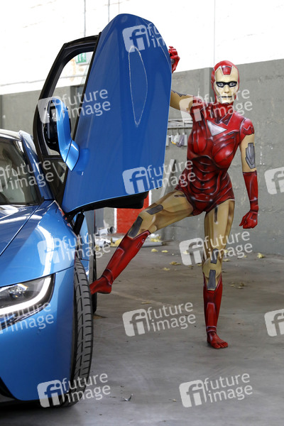 Projekt Farbkörper, Cosplay, Cosplayer, Bodypainting, Body-Painting, Make-up, Latexappliaktionen, Latexteile, Maskenbildnerei, Maskenbildner Körperkunst, Körperfarben, Farbe, Bemalung, Kunst, Malerei, Superheld, Superheldin, Comics, Comicfigur, Marvel, Iron Man, BMW i8, Hybrid Sportwagen, Stromauto, Elektroauto, Elektrofahrzeuge, Elektromobilität, unweltfreundlich, electric car, electric vehicles, electromobility, body painting, body art, superhero, super heroine, project color body, colors, colours