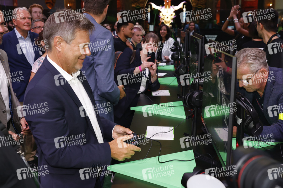Spiele-Messe, Gaming, Gaming-Industrie, Spieleindustrie, Spielemesse, Gamingindustrie, Player, Spielesucht, Digitalisierung, Zocken, Daddeln, Games, Game, Spiele, PC-Spiele, Computerspiele, Konsolen, Konsolenspiele, Videospiele, Fair, Event, Gamer, Unterhaltungselektronik, Software, Hardware, europäische Leitmesse für digitale Spielekultur, internationale Gaming-Community, Virtual Reality, Browsergames, Spieletrends, game - Verband der deutschen Games-Branche, Politiker, Bundesminister für Wirtschaft und Klimaschutz, Bündnis 90/Die Grünen, Vizekanzler