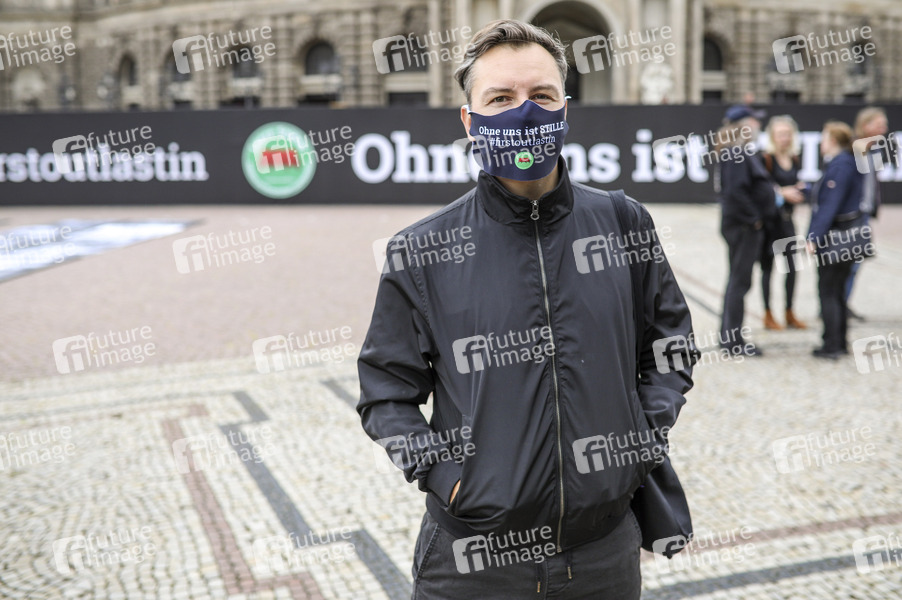 DJ Purple Disco Machine bei der Demonstration 'Ohne uns ist Stille' der Organisation 'Leere Stühle' auf dem Theaterplatz in der historischen Dresdner Altstadt. Künstler, Veranstalter und Unternehmen der Veranstaltungsbranche wie Caterer und Techniker demonstrieren gemeinsem, um auf die Probleme und Wichtigkeit ihrer Branche aufmerksam zu machen. Dredsen, 05.06.2020