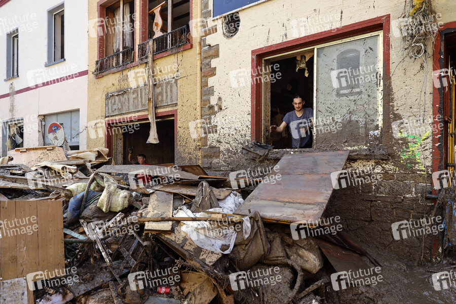 Nach dem Jahrhunderthochwasser in der Eifel durch heftige Regenfälle und Dauerregen mit Überschwemmungen und Überflutungen haben die Aufräumarbeiten im Ahrtal begonnen. Einheiten von Polizei, THW, Bundeswehr und Feuerwehr mitsamt vielen freiwilligen Helfern räumen Straßen, entfernen Schutt und Schlamm und versorgen die Menschen. Im Bild zerstörte Häuser in der Ortschaft Altenahr, in der die Flut viele Häuser zerstörte, 22.07.2021