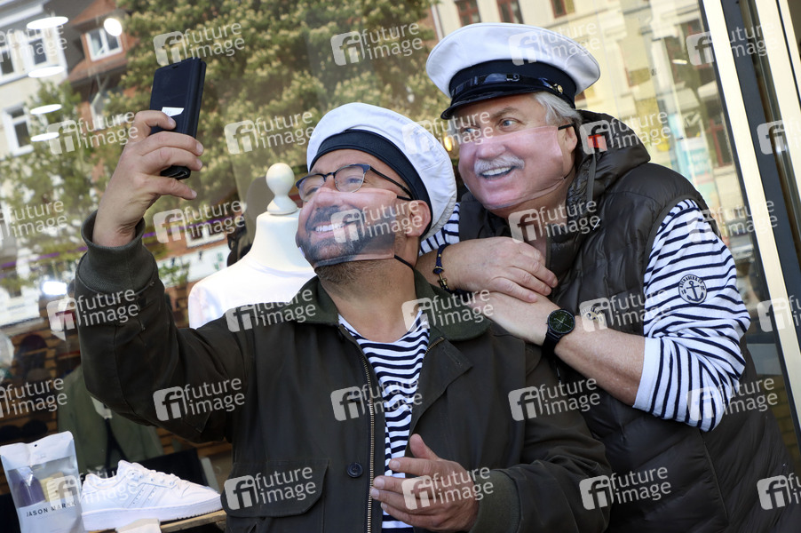 Claas Vogt und Klaus Baumgart von Klaus & Klaus beim Fototermin vor der Textildruckerei EINDRUCK, welche Mund-Nase-Masken mit dem echten Lächeln der Träger herstellt. Hamburg, 06.05.2020