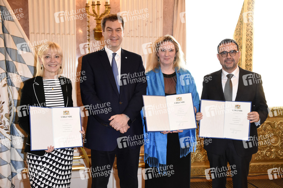 Carolina Trautner (Staatsministerin für Familie, Arbeit und Soziales), Markus Söder, Kerstin Schreyer (Staatsministerin für Wohnen, Bau und Verkehr) und Klaus Holetschek (Staatssekretär für Wohnen, Bau und Verkehr) bei der Aushändigung der Ernennungsurkunden an die neuen Kabinettsmitglieder im Prinz-Carl-Palais. München, 06.02.2020
