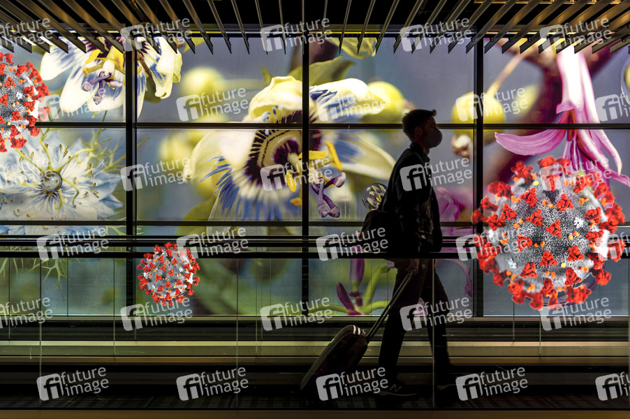 Notwendige Reisen in Zeiten von Corona. Bildmontage mit Reisenden in Flughafen Amsterdam Schiphol und einer 3D Illustration des Coronavirus vom CDC