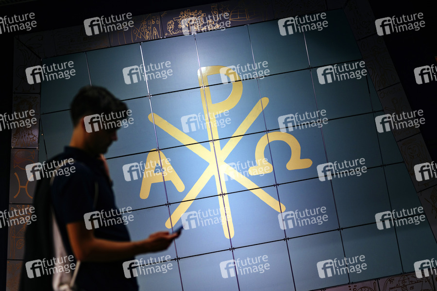 Ein Fahrgast posiert vor den Symbolen des Christentums im Hauptbahnhof. Kirchenaustritte in Deutschland sind auf einem historischen Rekordhoch. Bonn, 23.07.2020