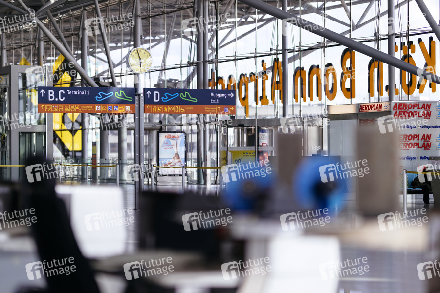 Impression vom menschenleeren Köln Bonn Airport, an dem es während der Coronakrise zu extremen Flugausfällen kommt. Köln, 30.04.2020