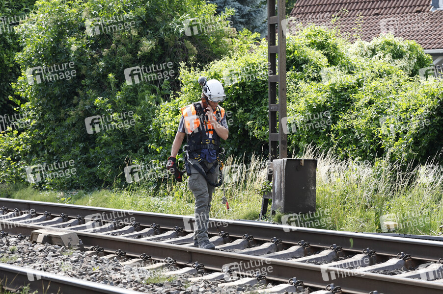 Mitarbeiter bei der Signalinstallation beim Fototermin 'Helikopter fliegt Signalmaste für das neue Elektronische Stellwerk in Bonn-Beuel ein'. Es beginnt letzte große Bauphase vor der Generalsanierung der rechten Rheinstrecke im Jahr 2026. Mit Hilfe eines Helikopters werden knapp 50 Signalmaste für das neue ESTW Bonn-Beuel eingeflogen. Bonn, 14.06.2025