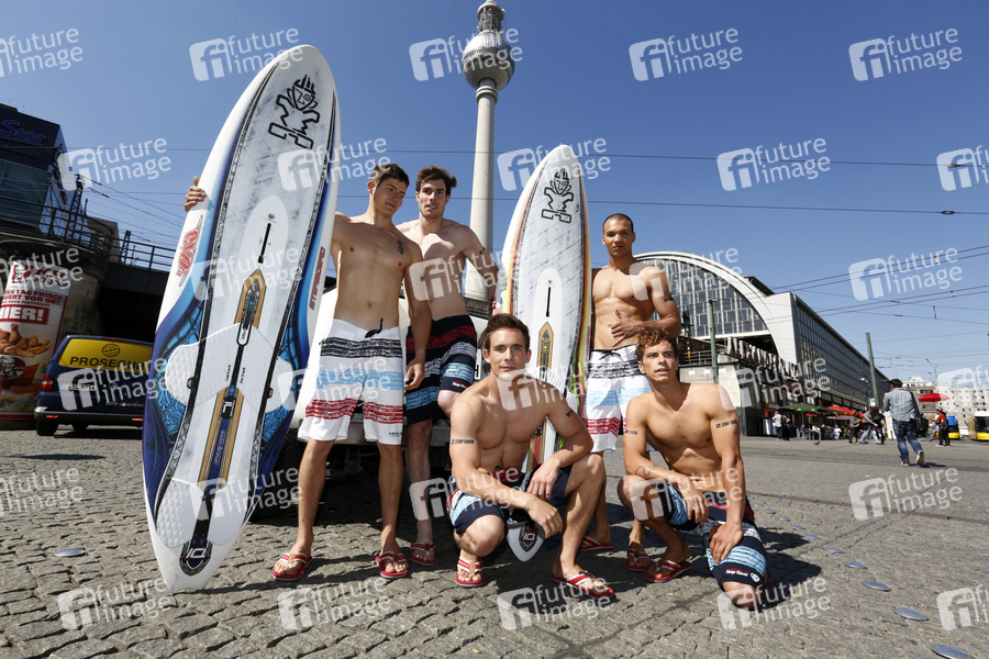 Open Air-Fashionshow des Menswear-Labels Camp David mit Surfern in sexy Beachwear der 'Special Collection Björn Dunkerbeck by Camp David' vor dem Fernsehturm am Alexanderplatz. Berlin, 28.04.2014