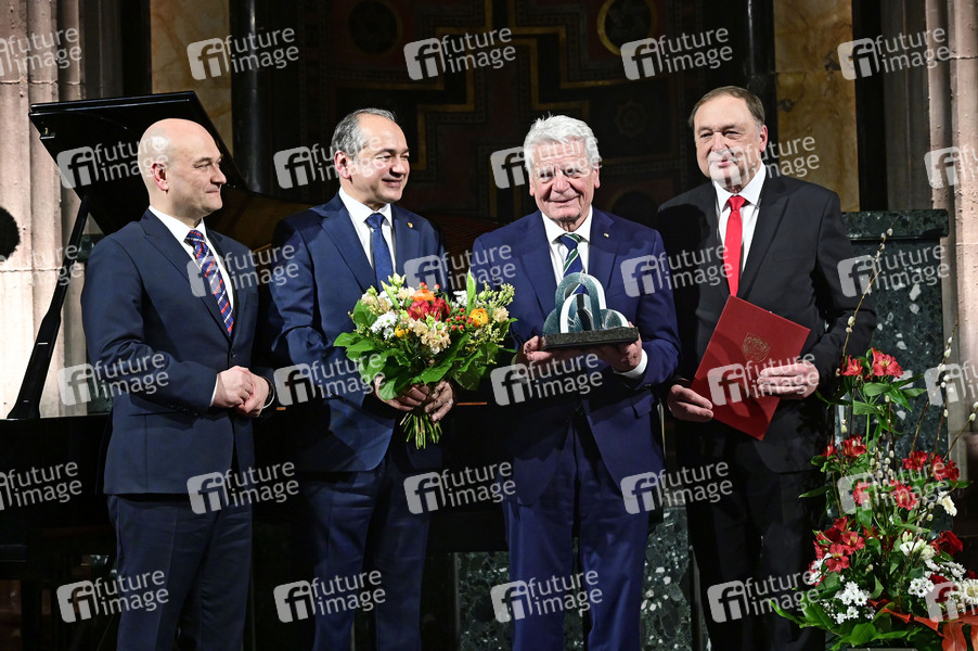 Rafal Gronicz, Octavian Ursu, Joachim Gauck und Willi Xylander bei der Verleihung des Internationalen Brückepreises der Europastadt Görlitz / Zgorzelec an Joachim Gauck im Kulturforum Görlitzer Synagoge. Görlitz, 04.02.2026