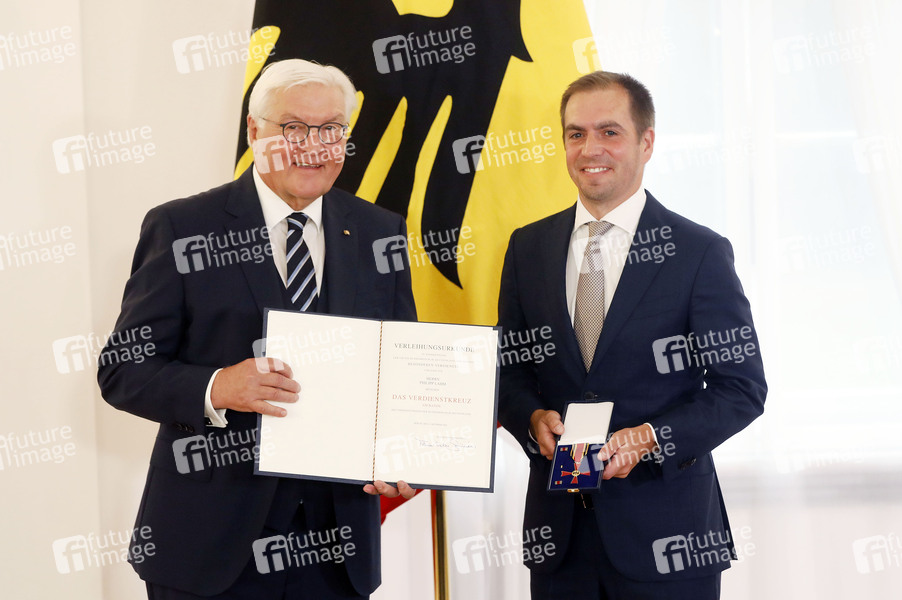 Frank-Walter Steinmeier und Philipp Lahm bei der Verleihung des Verdienstkreuzes am Bande der Bundesrepublik Deutschland an Philipp Lahm im Schloss Bellevue. Berlin, 01.10.2025